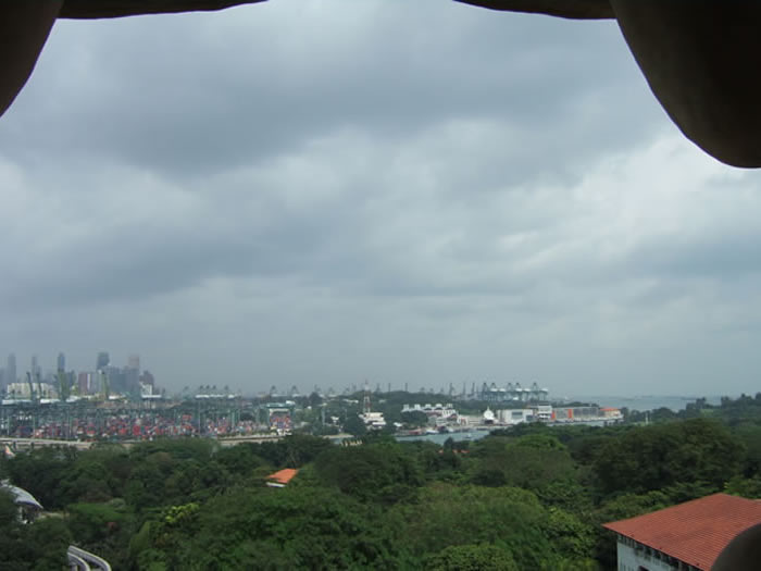 マーライオンの上に昇り、口の中から対岸の市街を一望したところ。