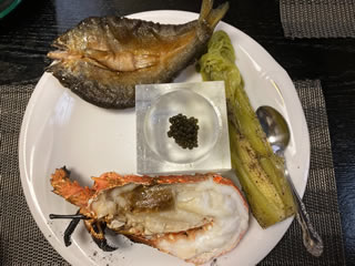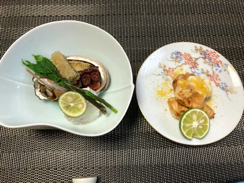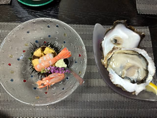 白子焼、天使のえび、岩ガキ、キャビアを乗せていただく鮎せんべいなど洗練された料理をいただきました。