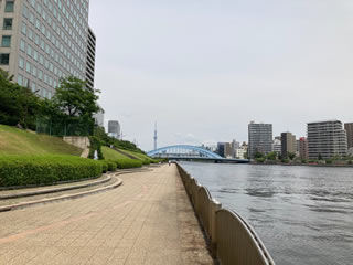 中央大橋から新川公園(隅田川テラス)を永代橋まで歩き、めでたい屋で尾道ラーメンを。
