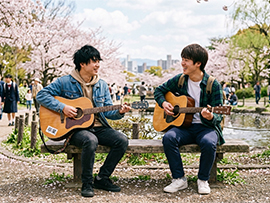 写真は、書き下ろしの葉羽詩集「卒業」のAI生成画像。それぞれの道へと進学し、長く付き合った友との最後の演奏になる別れの日の公園で。 葉羽詩集「卒業」
