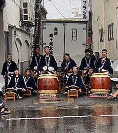 太鼓の演奏はアーケードの屋根の下。