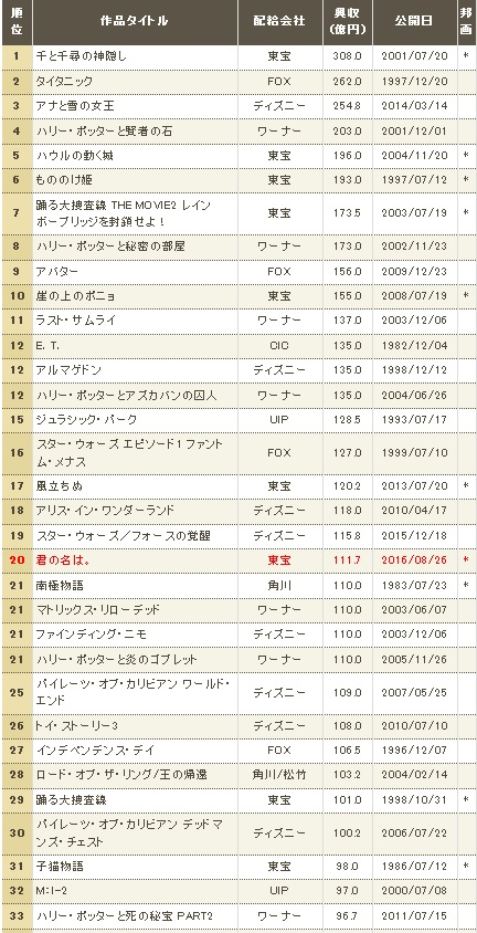 ちなみに9/26にツイッターに投稿されたmoviewalkerの「元編集長の映画便り」さんによれば、洋画を含めた日本での興行収入ランキングは以下。
