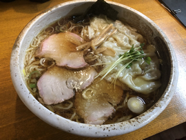 ワンタンは海老ワンタンのように見える・・プリっぷりの。そして大きなチャーシュー。これは福島駅東口の『あきんどう』と同じタイプのラーメンのようだ。