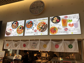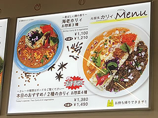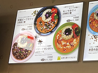なにが違うかと言えば、「キーマカリィお惣菜3種」(990円)とか「バターチキンカリィお惣菜3種」(990円)とか、カレーの色合いも違うが、その上に不思議なトッピングがあったり、3種もお惣菜を盛り込んである。