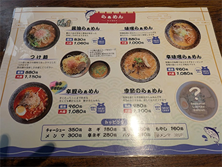 それに「味噌」(880円)・「辛味噌」(960円)・「つけ麺」(880円)・「辛鰹らぁめん」(960円)までがグループの共通メニューで、独自の「季節らぁめん」は現在空欄になっている。