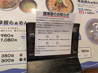 ちょっと、ココ見てよ。「麺増量のお知らせ」だって!