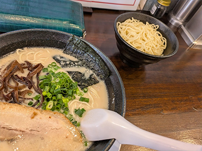 僕はとんこつラーメンと替え玉を。これが「学生」であれば替え玉一回「無料」なのを見て忸怩たる思い。(心はまだ学生気分なんだけど・・)