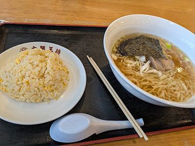 ~と悩みながらも勢いで入店し、まだお昼だし餃子は食べたくないと思ったので、お試しの「ラーメン半チャーハンセット」を注文。