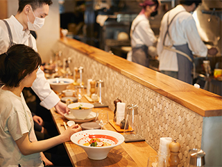 しかしこの海老丸らーめんの新機軸は、海老にオマール海老を使って、フランス料理の手法や盛り付けやサービスなどを用いて表現している点。だから、いわゆるラーメン屋=ラーメン専門店ではなくて、ラーメンも提供するフランス料理店(レストランではなくビストロ)なのである。実際に経営者は麻布でフレンチ・レストランを経営している。