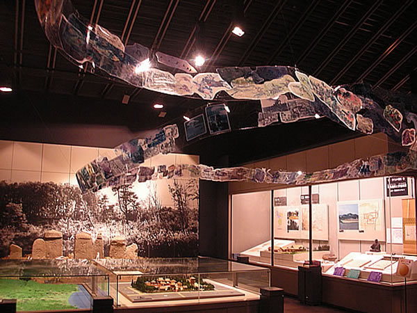 中世の展示室の上空に張り渡された「たたかい」の絵巻。